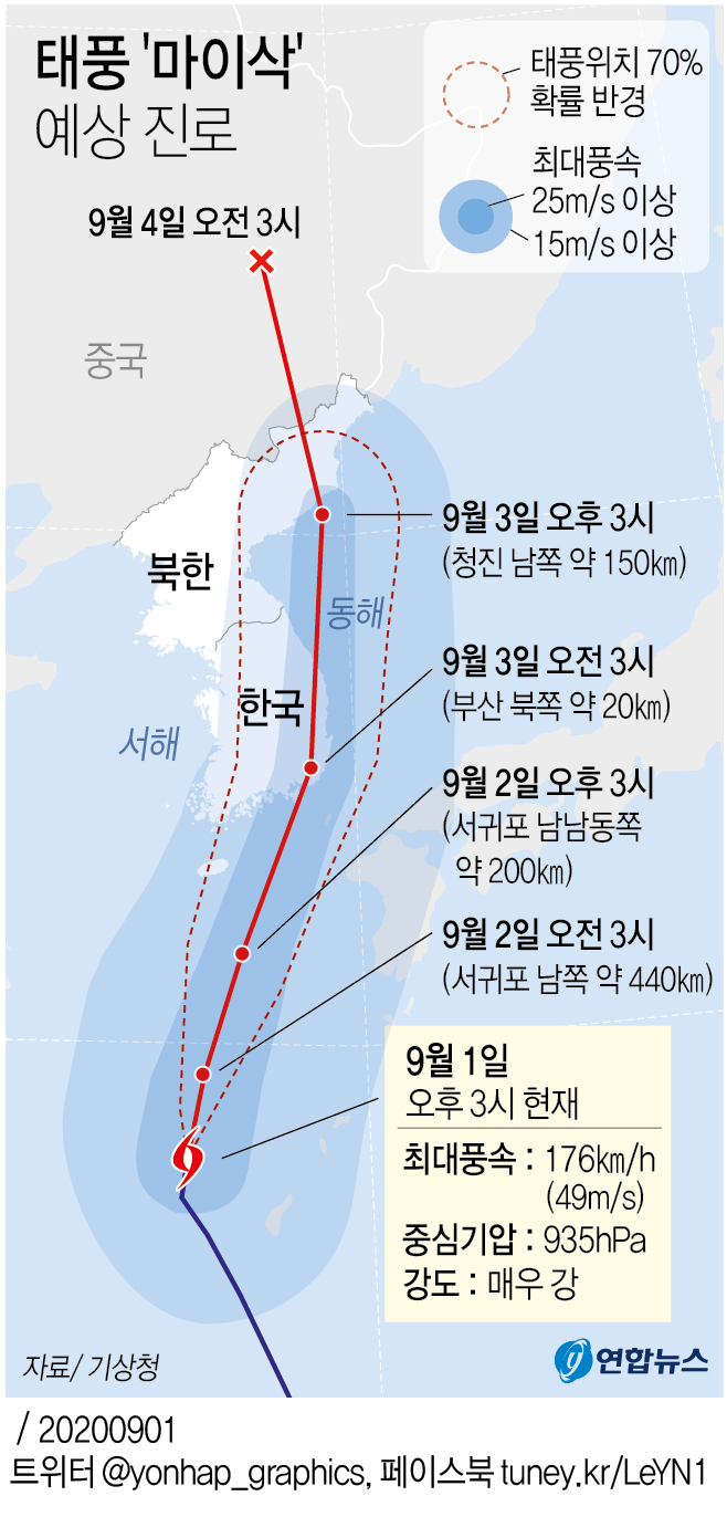 기상청 우진규 예보분석관은 마이삭은 3일 오전3시께 경남 해안 부근에 상륙할 가능성이 가장크다며 구체적인 지점은 거제와 부산사이정도로 예측하나 북상 과정에서 주변 환경에 따라 달라질 수 있다고 설명했습니다.