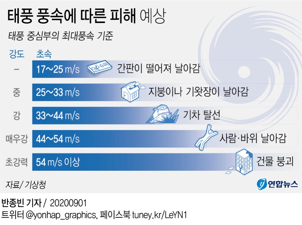 예상 초대순간풍속은 제주도와 경상 해안 시속 108~180km(초속 30~50m),강원 영동,남부지방(경상 해안과 전북 서부 제외)72~144km(20~40m), 그 밖의 지방 36~108km(10~30m)입니다.